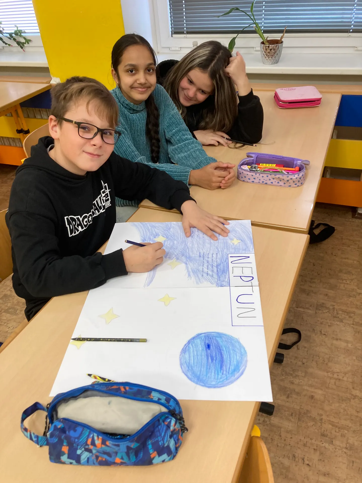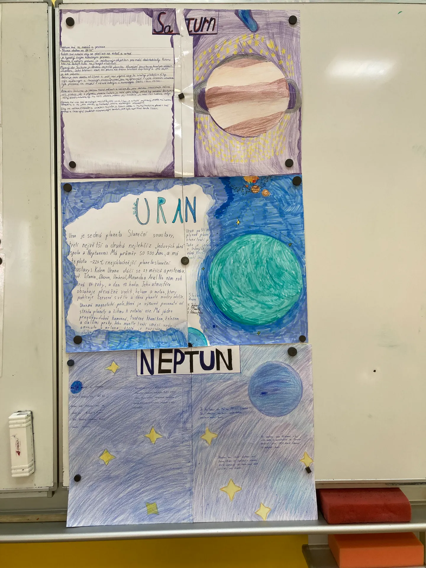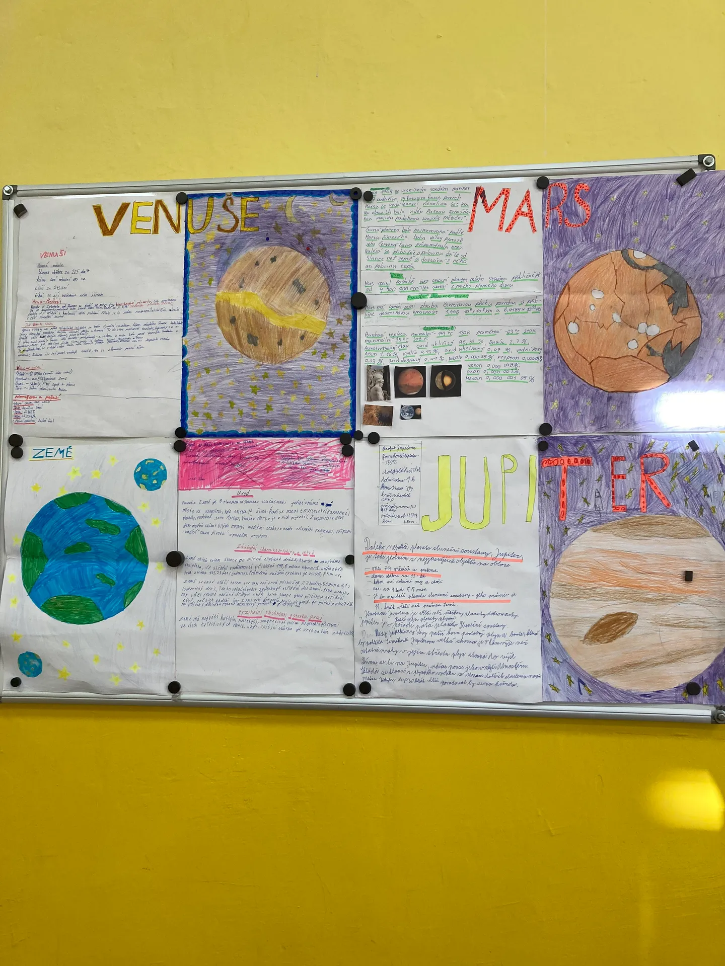 Žáci pracovali ve dvojicích na tématech z celého vesmíru; planety, Měsíc, Slunce, Mléčná dráha, souhvězdí, kosmonautika, hvězdárny a mnoho dalšího. Každý tým připravil referát, obrázky a kreativní prvky jako otevírací okénka, mini knížečky a různé nalepovací prvky. Vše jsme poté spojili do jedné třídní knihy.