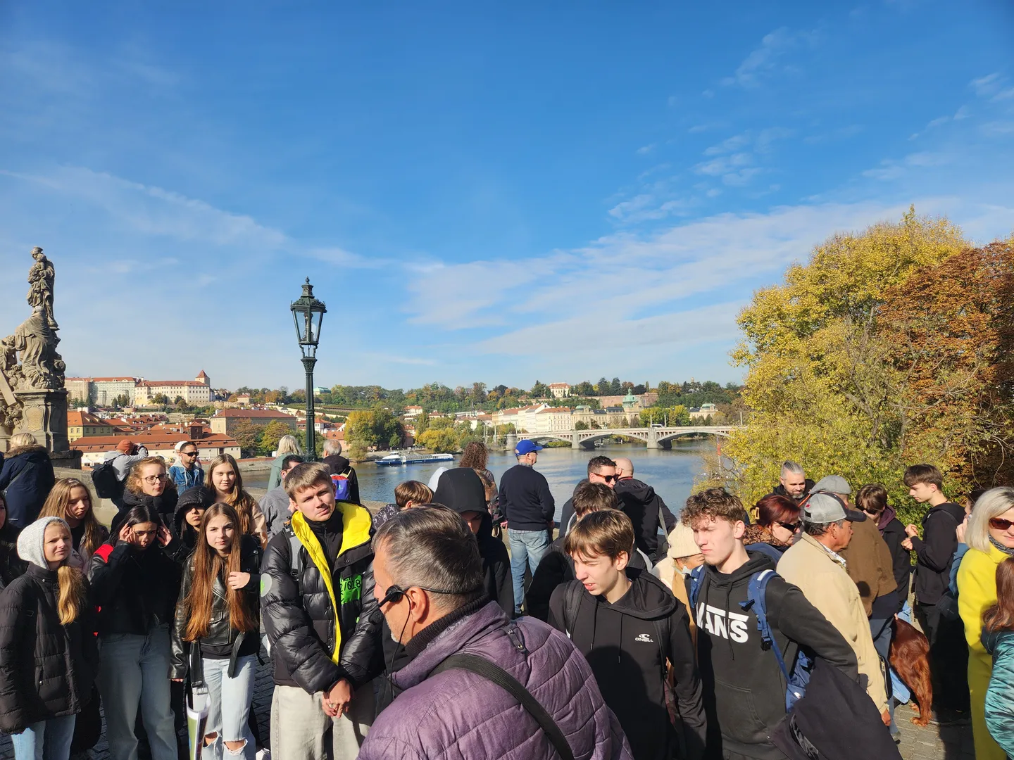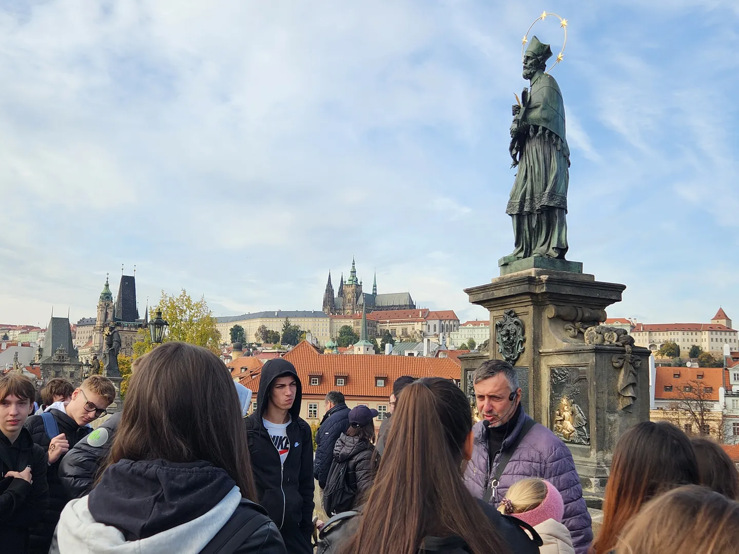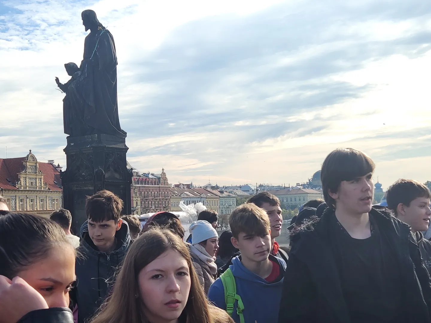 Po doplnění energie na nás čekal u sochy Karla IV. pan Nebeský s devadesáti minutovou akční hrou Praha hravě aneb rychlovka na Karlově mostě a bojovka na Kampě. Žáky čekaly kromě úkolů a zlaťáků také rychlé přesuny, každému se jistě do paměti vryla věta našeho průvodce: "Excuse me..., school...," kdy jsme se prodírali davy turistů ve svižném tempu na další soutěžní stanoviště.