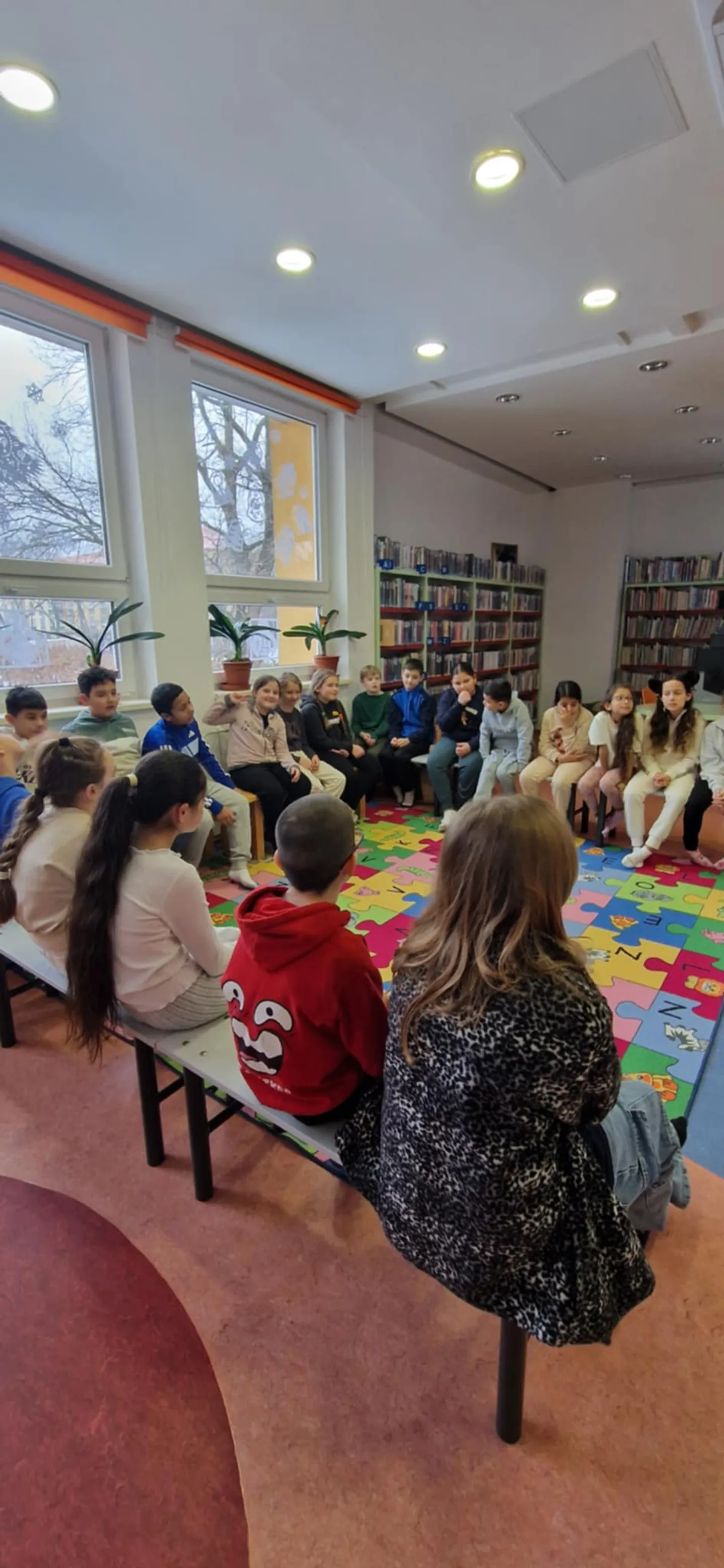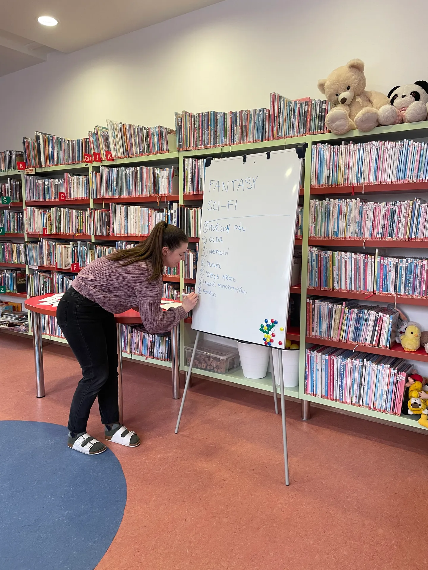 Dnes jsme navštívili knihovnu v kulturním domě, kde si pro nás paní knihovnice připravila besedu na téma Fantazii se meze nekladou. Povídali jsme si o knihách, jejich žánrech, autorech i ilustrátorech. Vyzkoušeli jsme si vymýšlení vlastního příběhu a také jsme psali vzkaz mimozemšťanům. Návštěva knihovny nás moc bavila a odnášíme si spoustu zajímavostí ze světa knih.