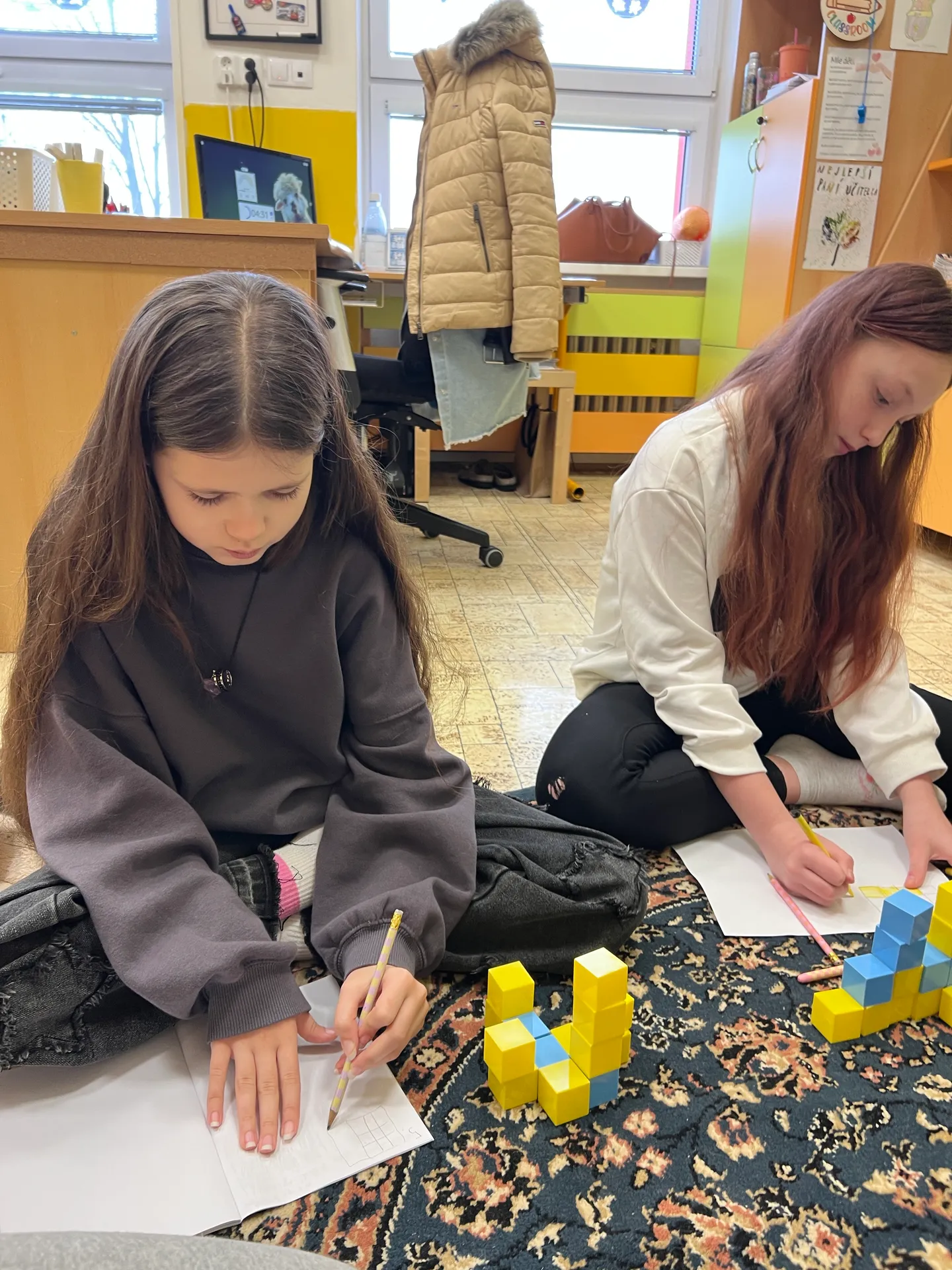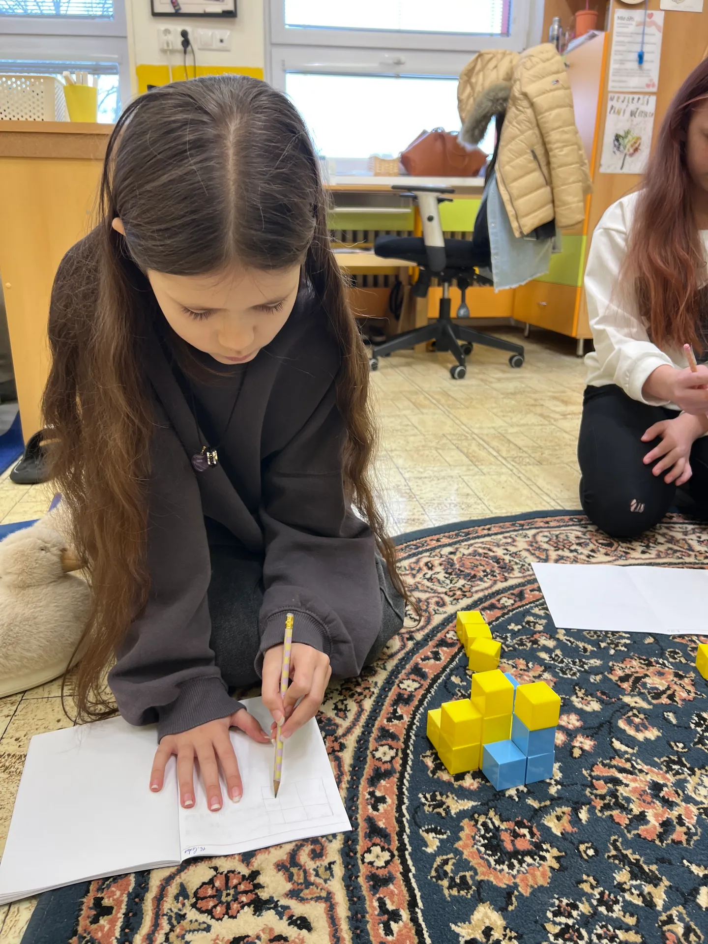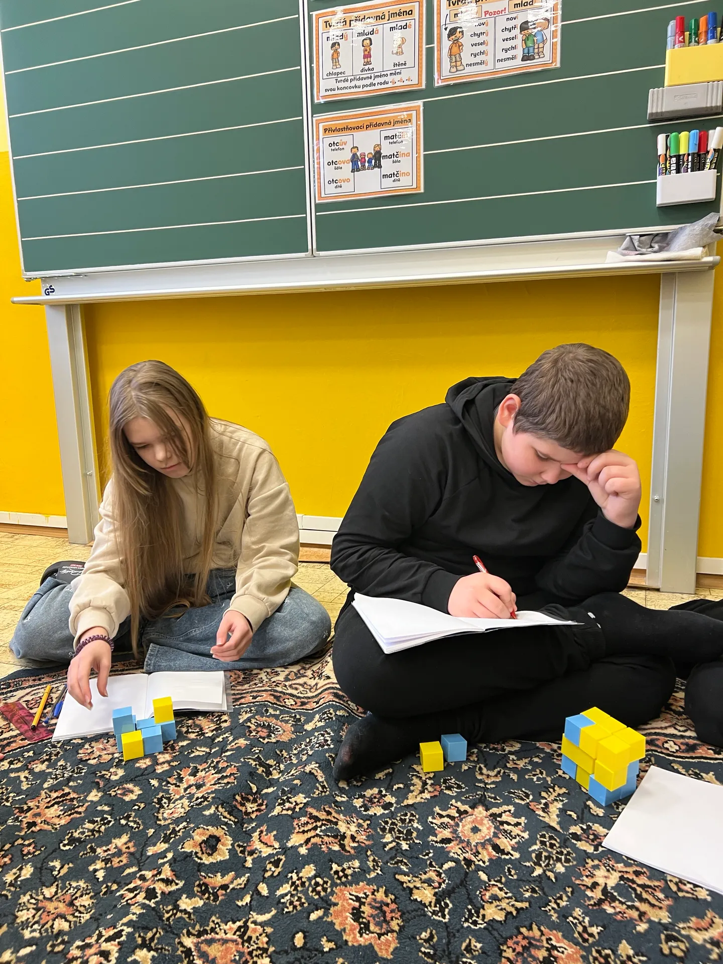 Žáci 5.A si v hodině matematiky vyzkoušeli práci s prostorovými útvary. Z kostek vytvářeli krychlové stavby a poté je zakreslovali ve formě půdorysu, nárysu a bokorysu. Mrázová V.