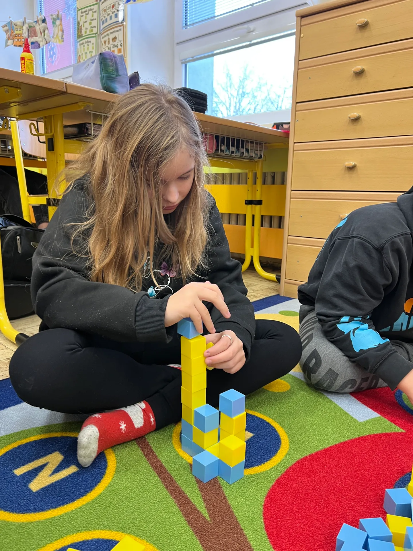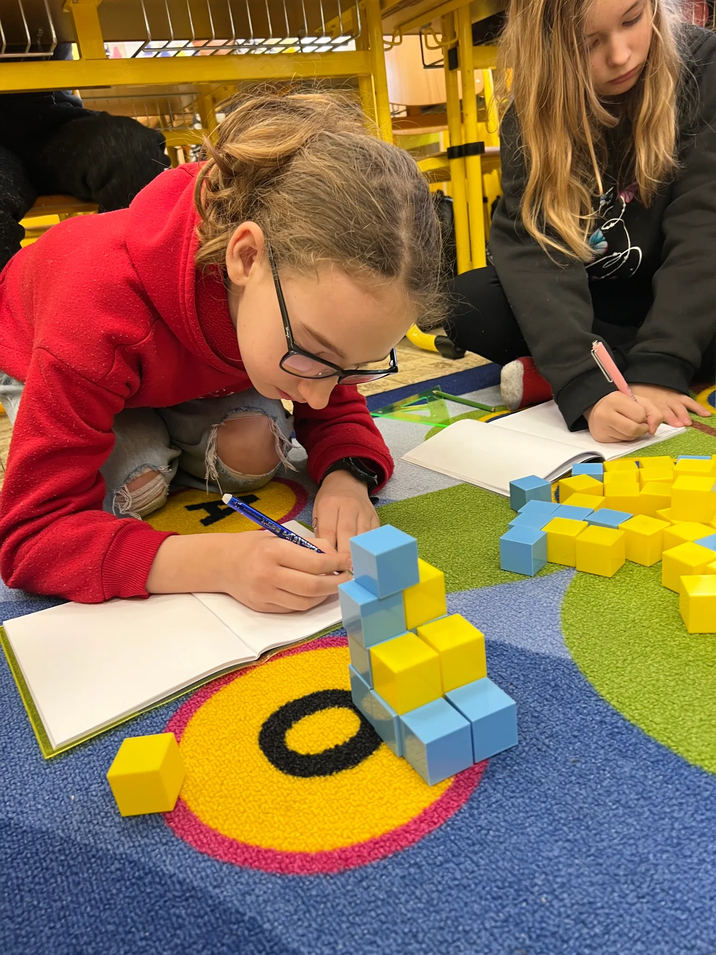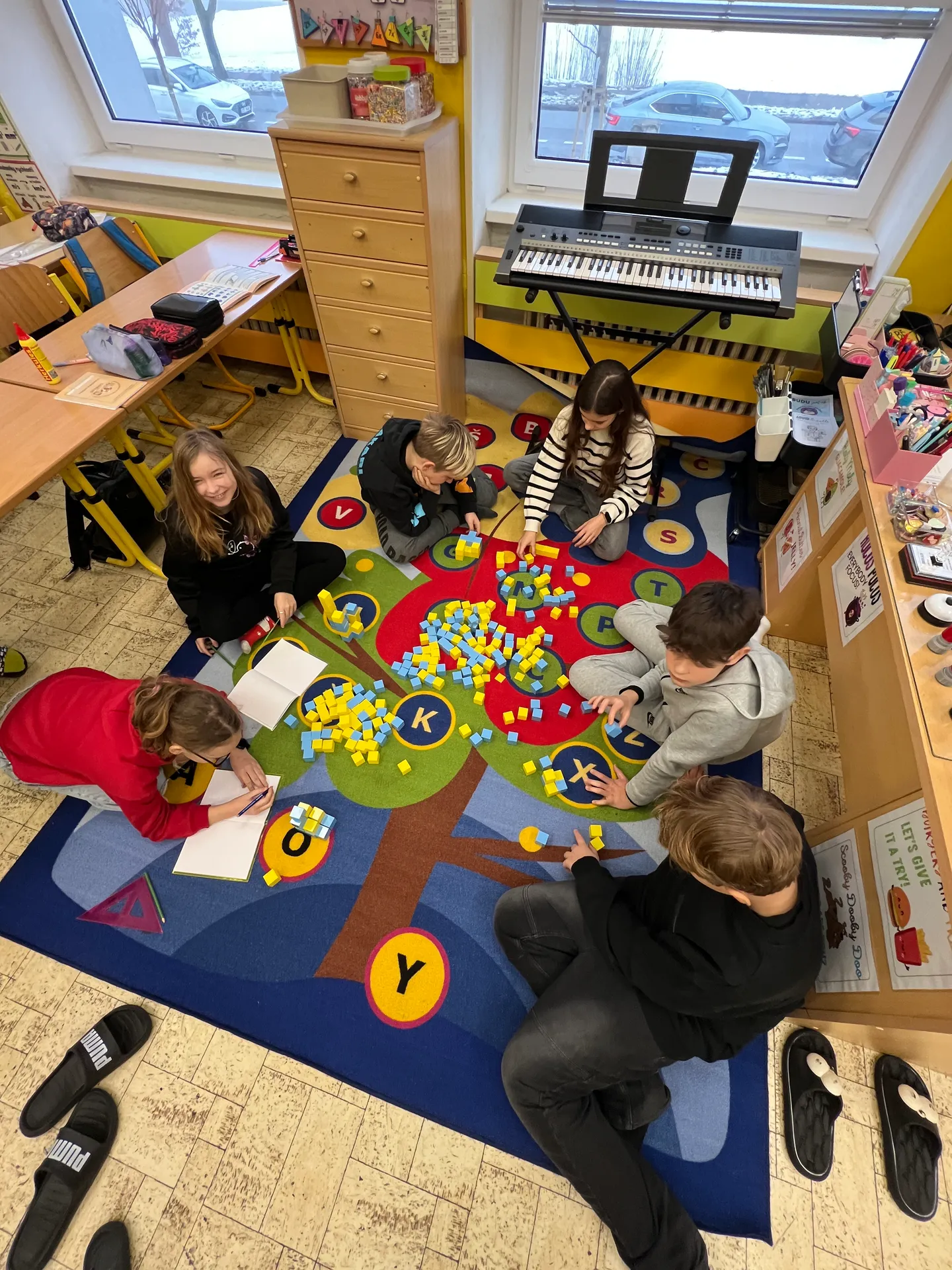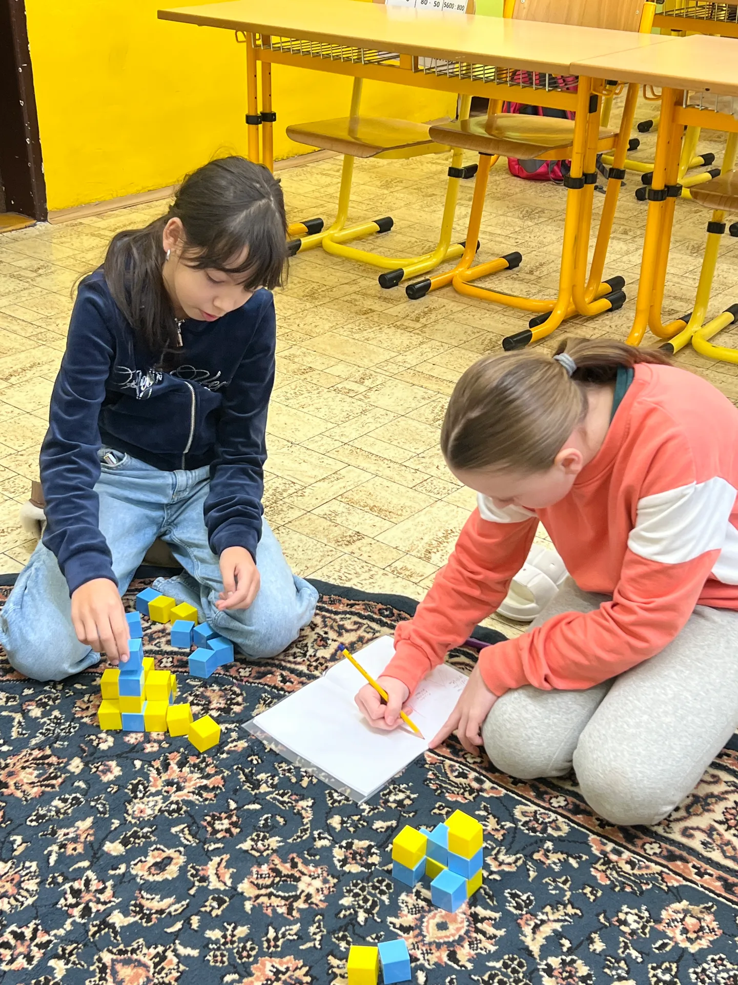 Žáci 5.A si v hodině matematiky vyzkoušeli práci s prostorovými útvary. Z kostek vytvářeli krychlové stavby a poté je zakreslovali ve formě půdorysu, nárysu a bokorysu. Mrázová V.