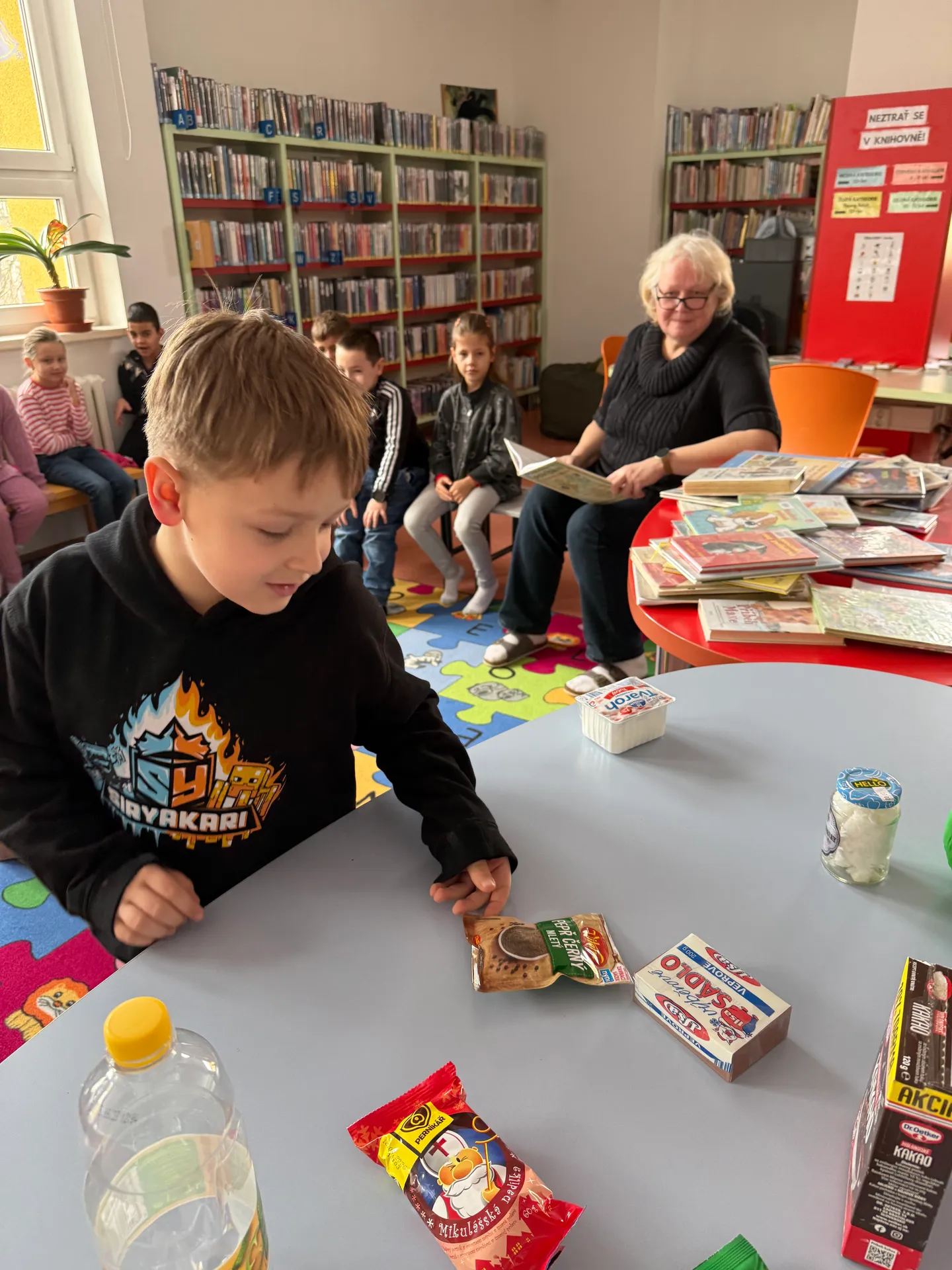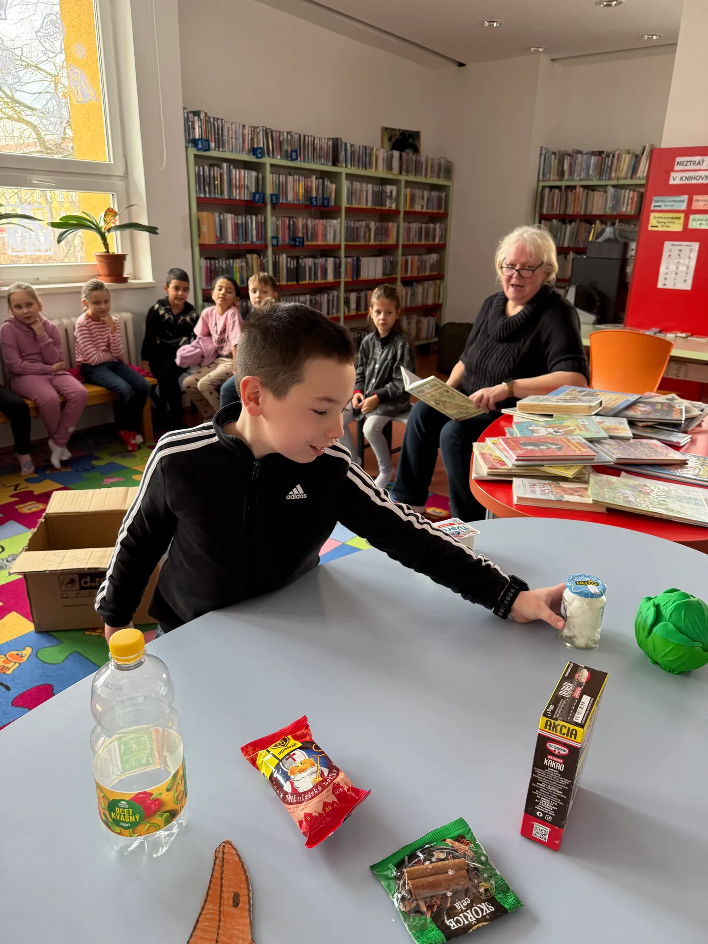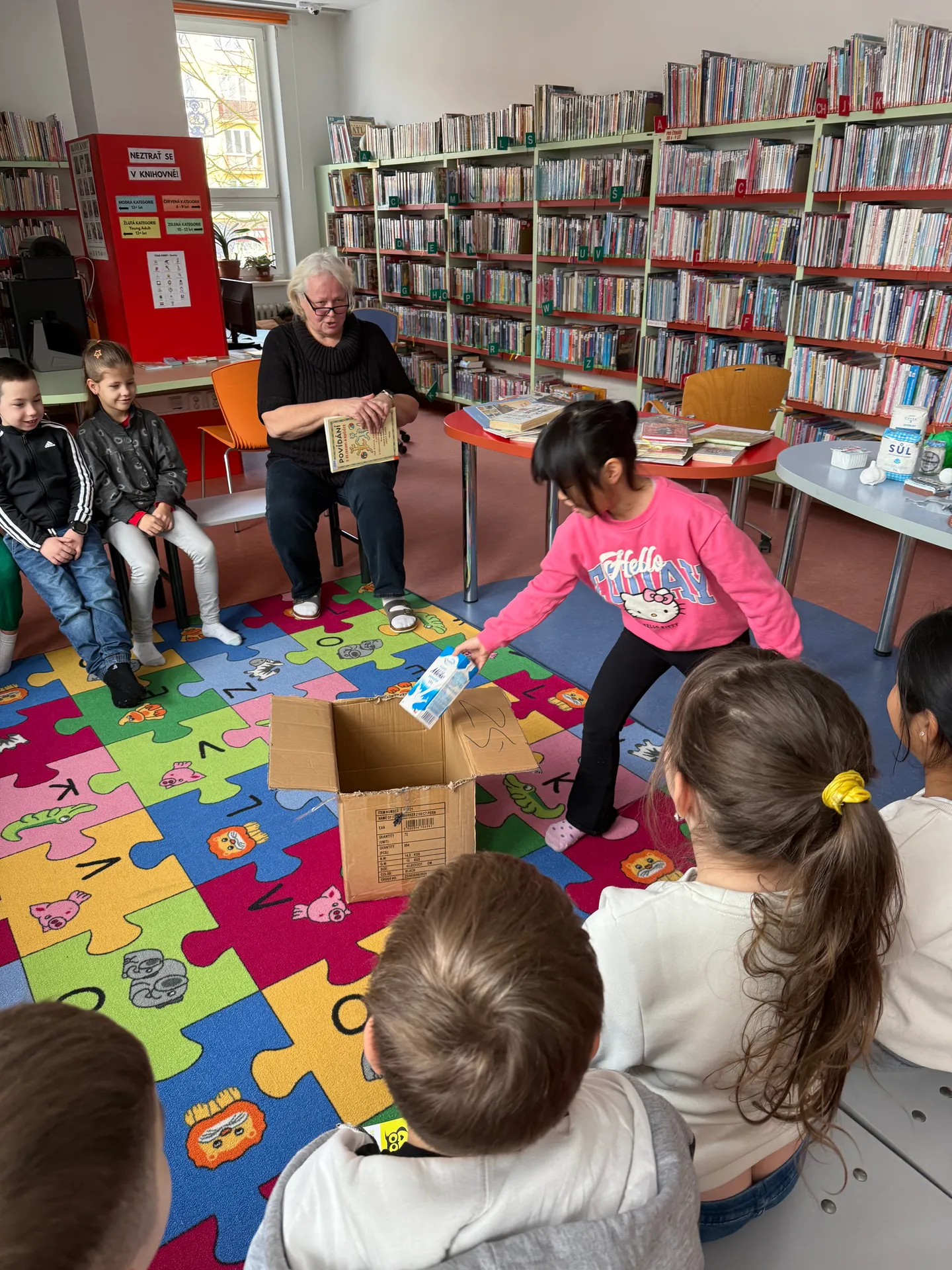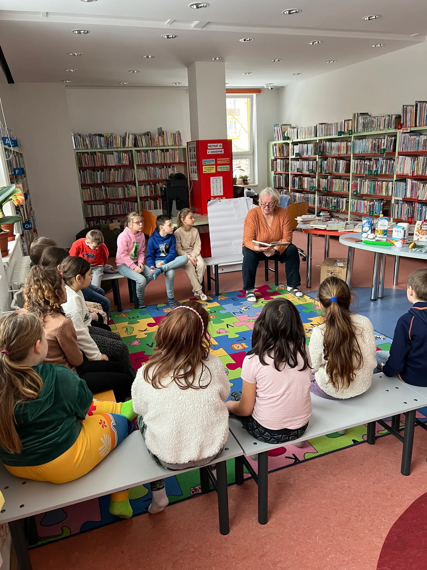 Druháčci navštívili knihovnu, kde pro ně byla připravena beseda o knížce Povídání o pejskovi a kočičce. Poslouchali ukázku z knížky a zjistili, co všechno pejsek a kočička dali do dortu, aby byl nejlepší. Beseda se moc líbila.