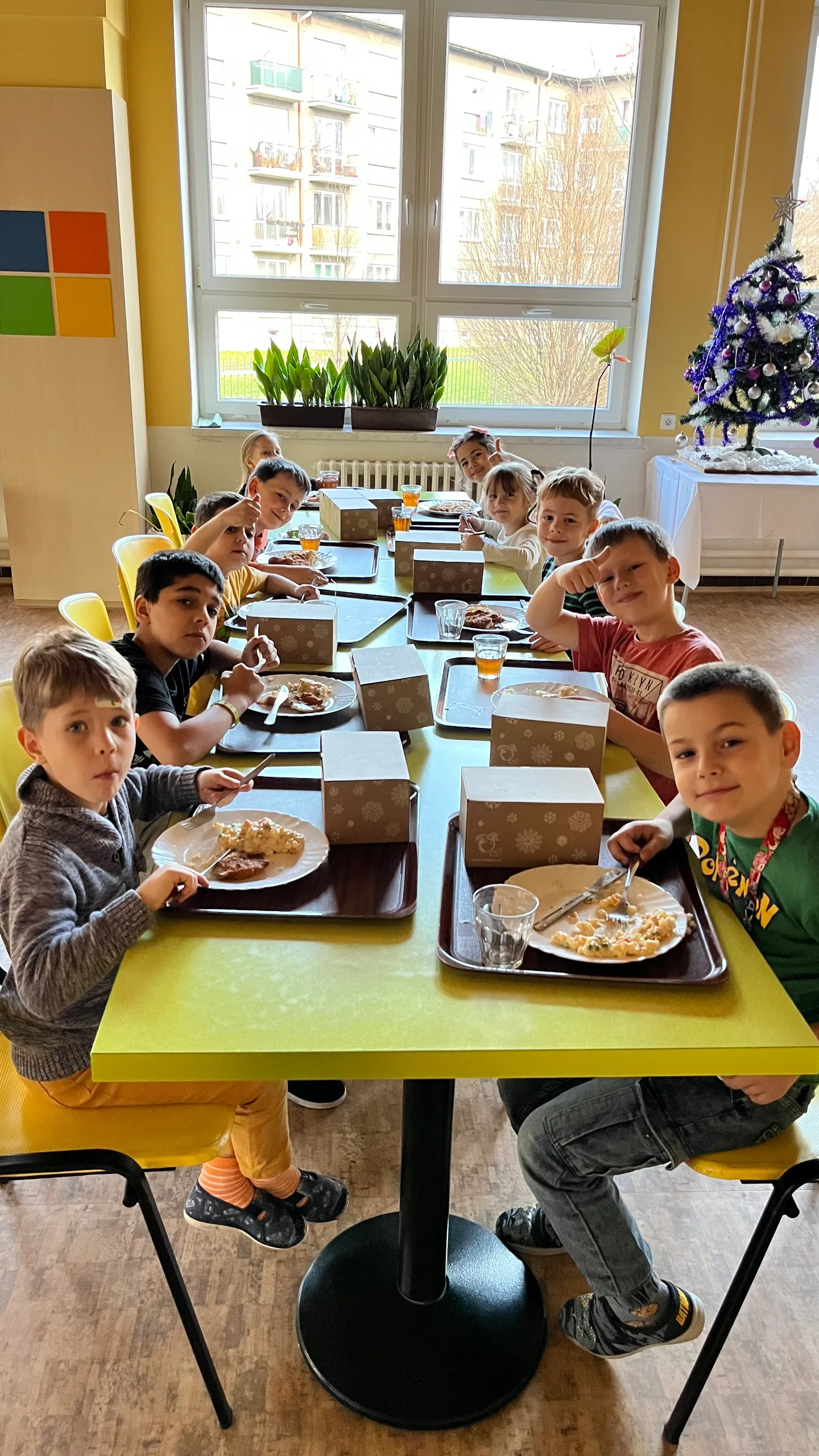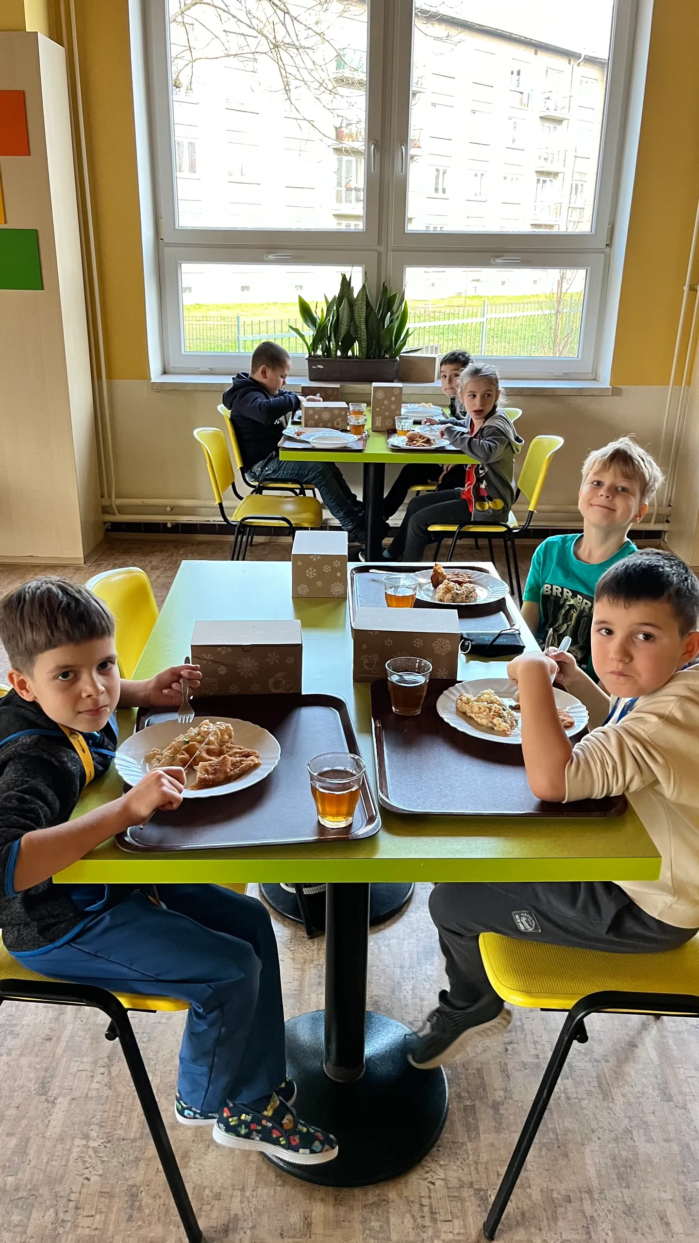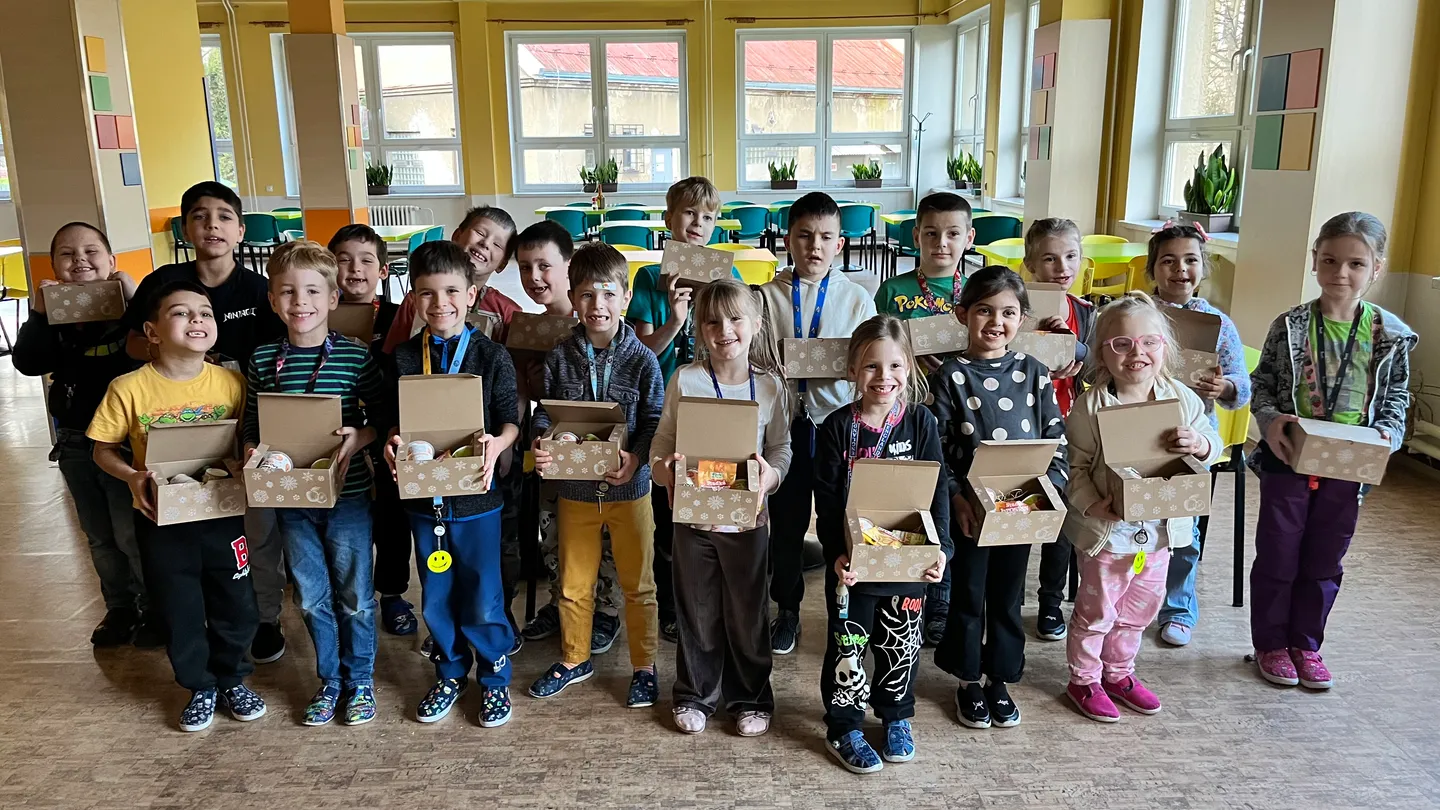 Prvňáčci děkují zaměstnancům školní jídelny za krabičku plnou dobrot i za výborné obědy, které jim s láskou připravují. Jako malé poděkování vyrobily děti z prvních ročníků papírové medaile.