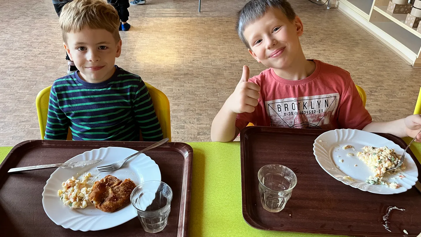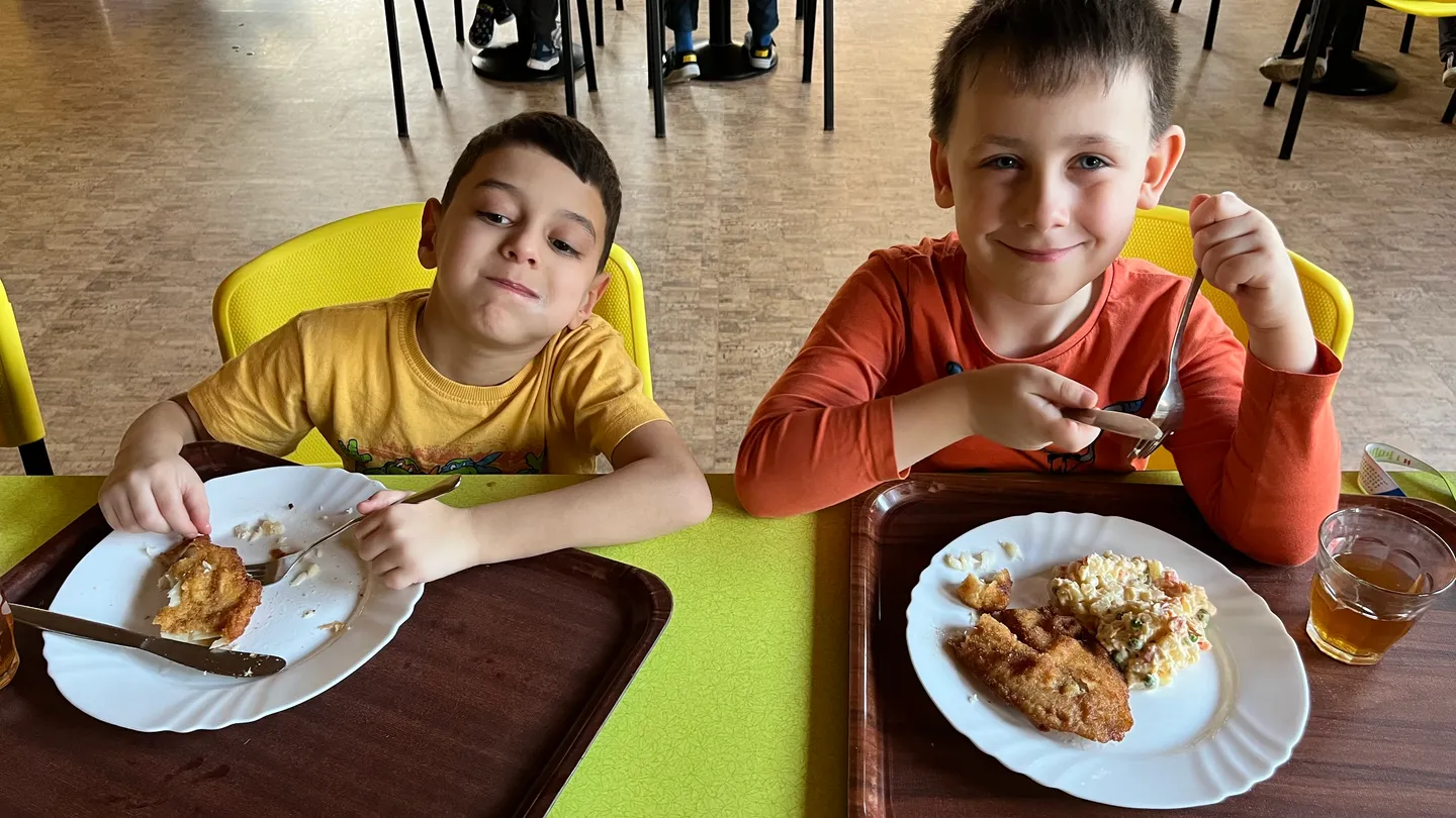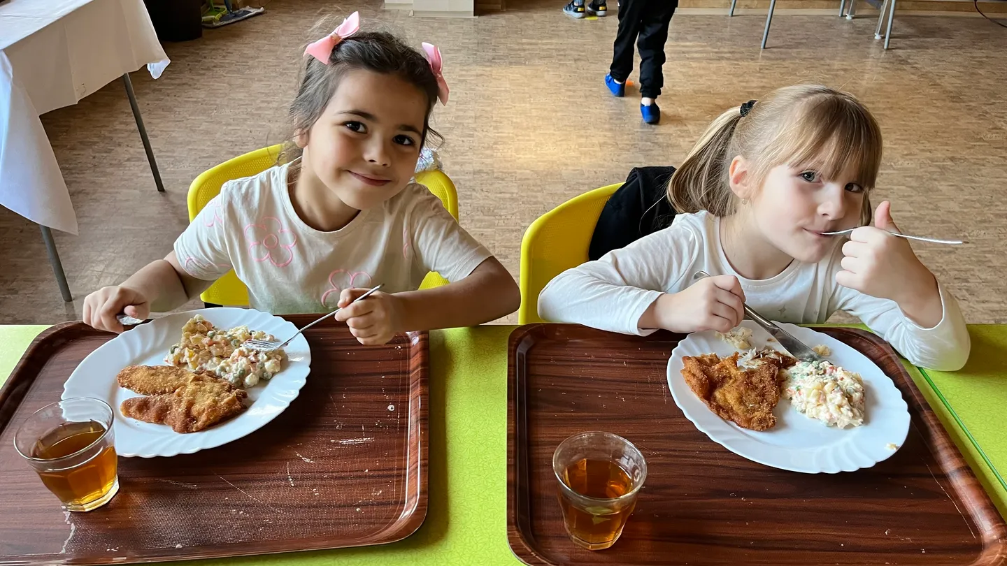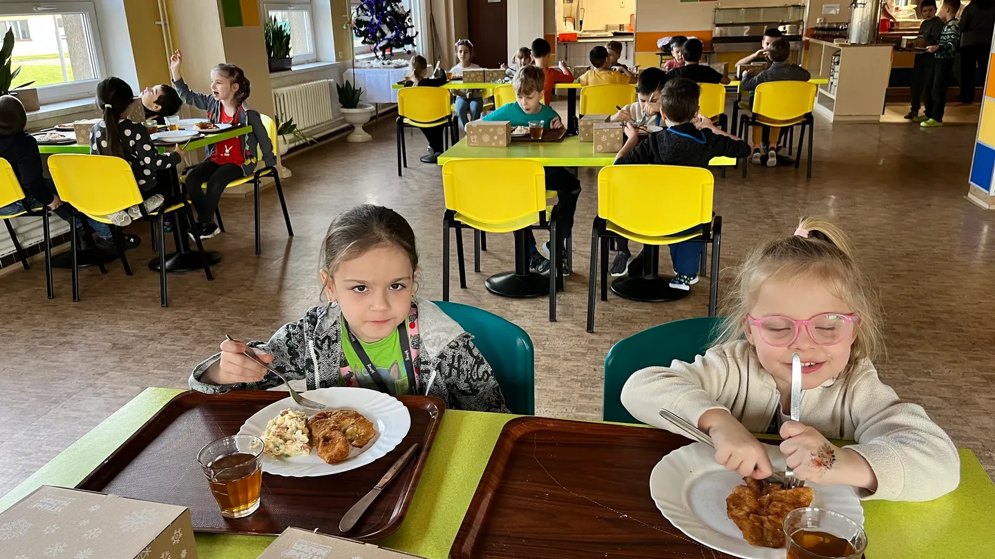 Prvňáčci děkují zaměstnancům školní jídelny za krabičku plnou dobrot i za výborné obědy, které jim s láskou připravují. Jako malé poděkování vyrobily děti z prvních ročníků papírové medaile.