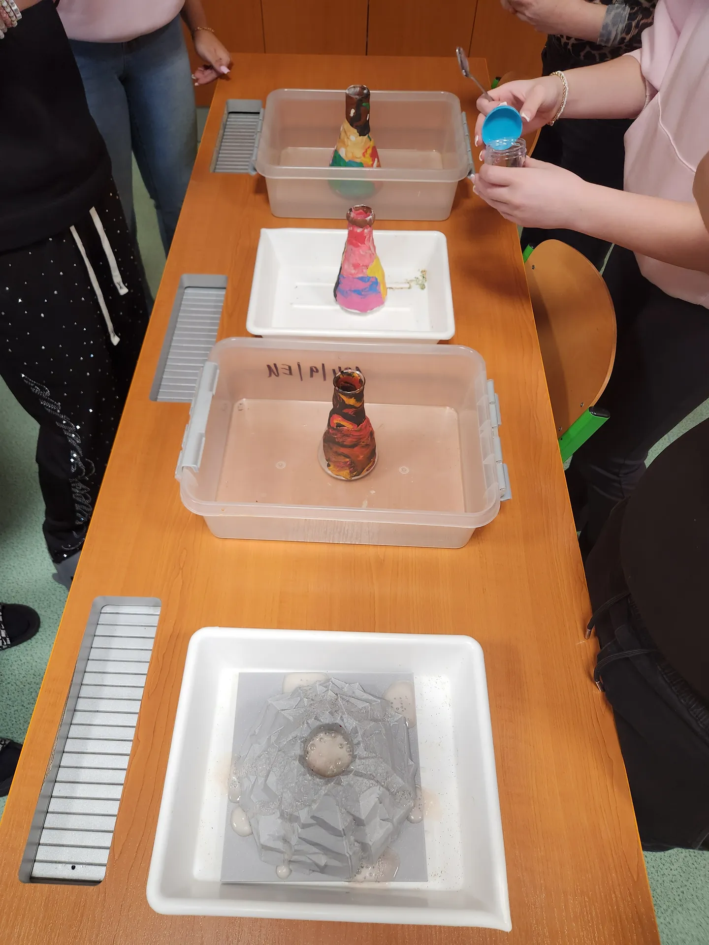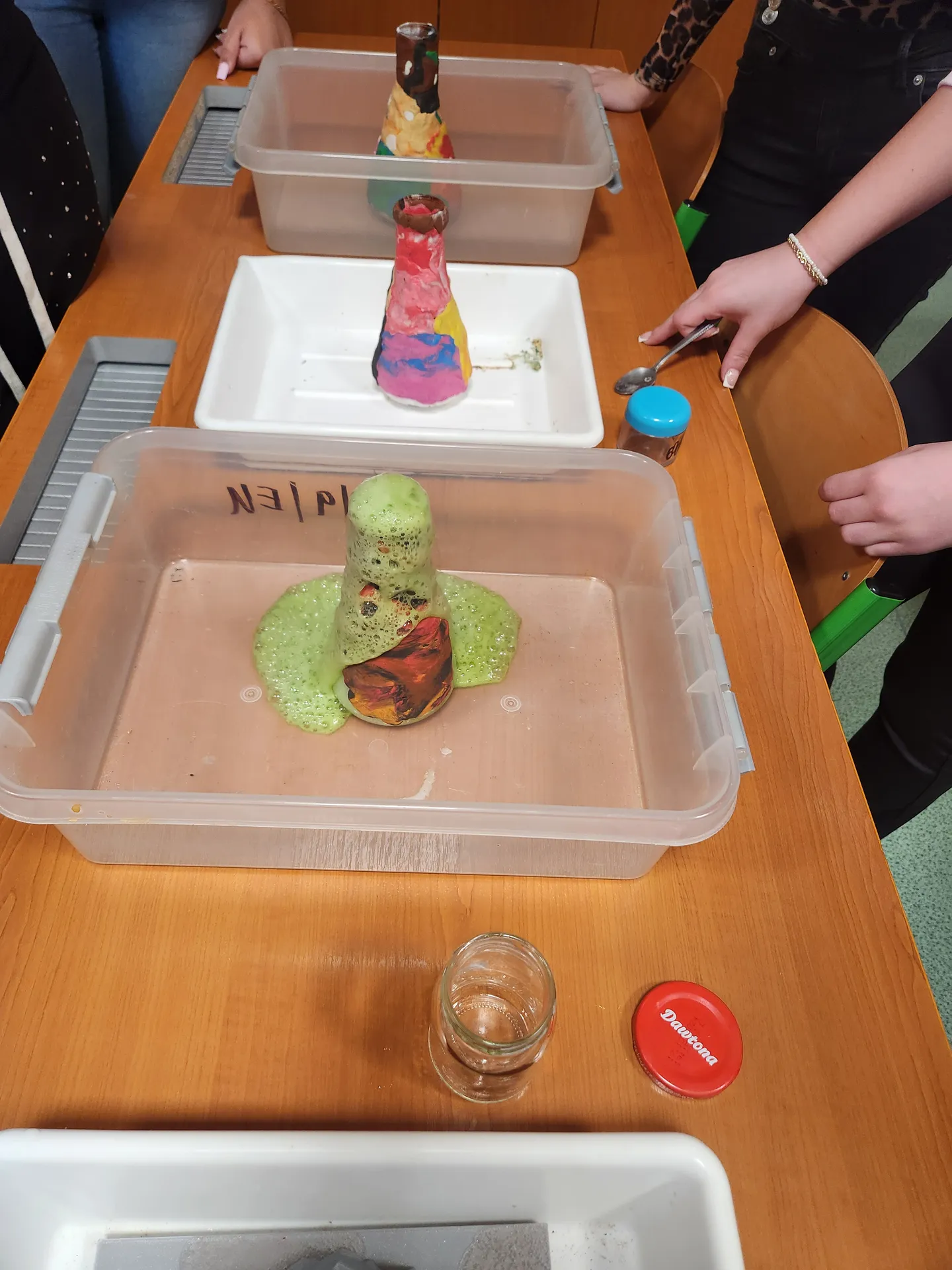 Na fotografiích je krystalizace modré skalice, práce s digitálními mikroskopy, samostatná laboratorní práce s chromatografií barviv z fixu na křídě, tajná písma, PF 2026 v podobě lávové lampy a výbuchy sopek s modelem z 3D tiskárny, kterou vyrobili starší žáci ve své ročníkové práci s kolegou Matějem Venglářem. Děkujeme za novou pomůcku do výuky :-)