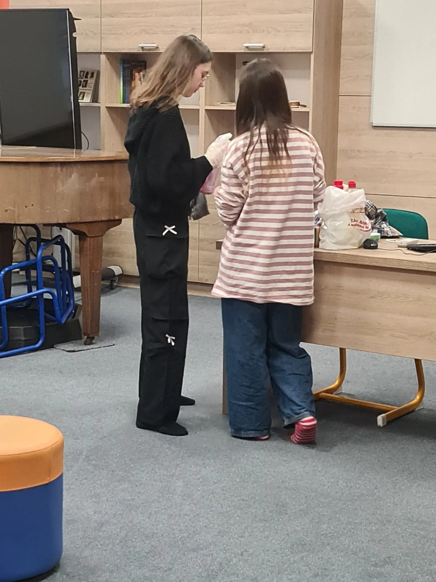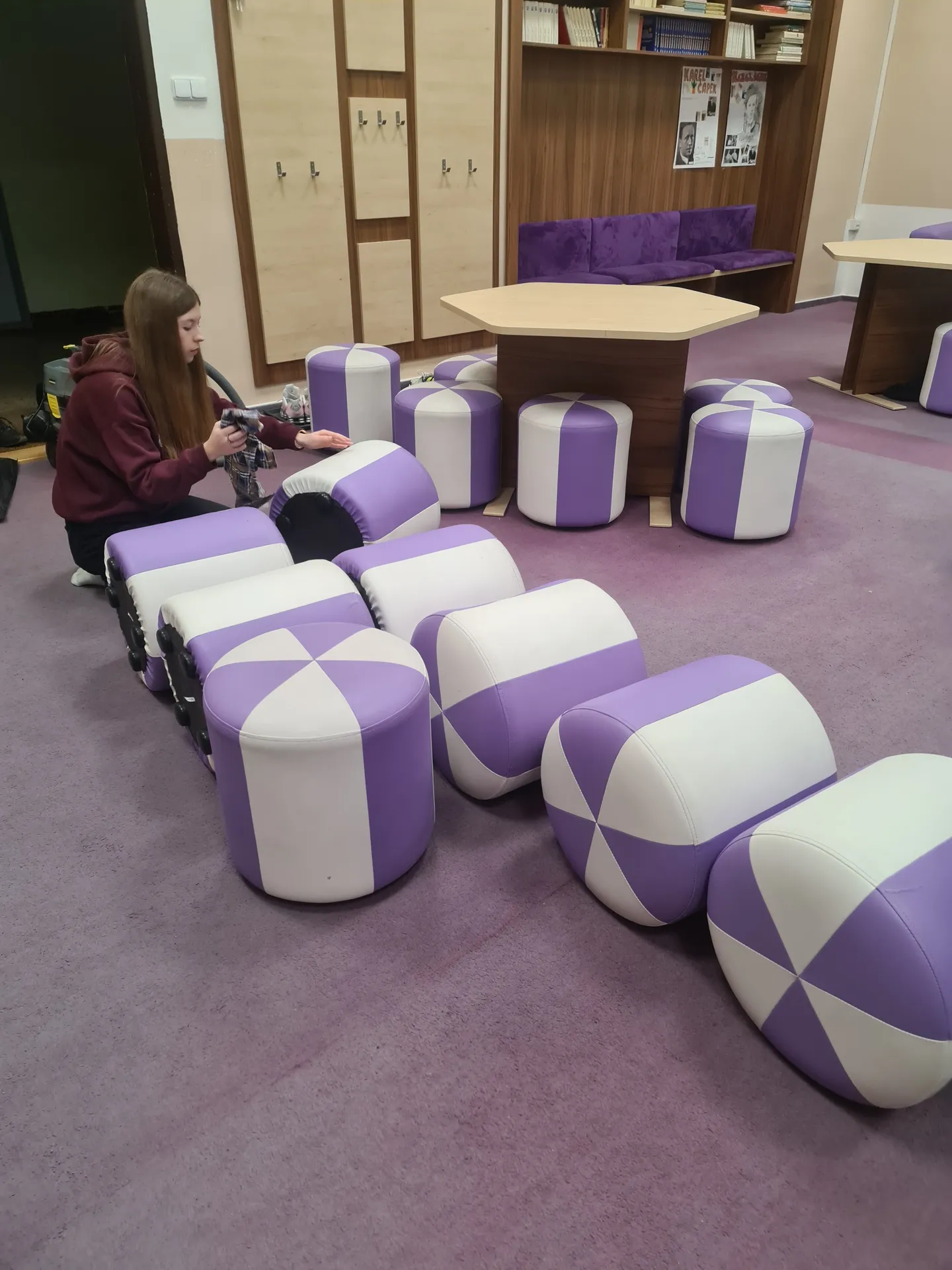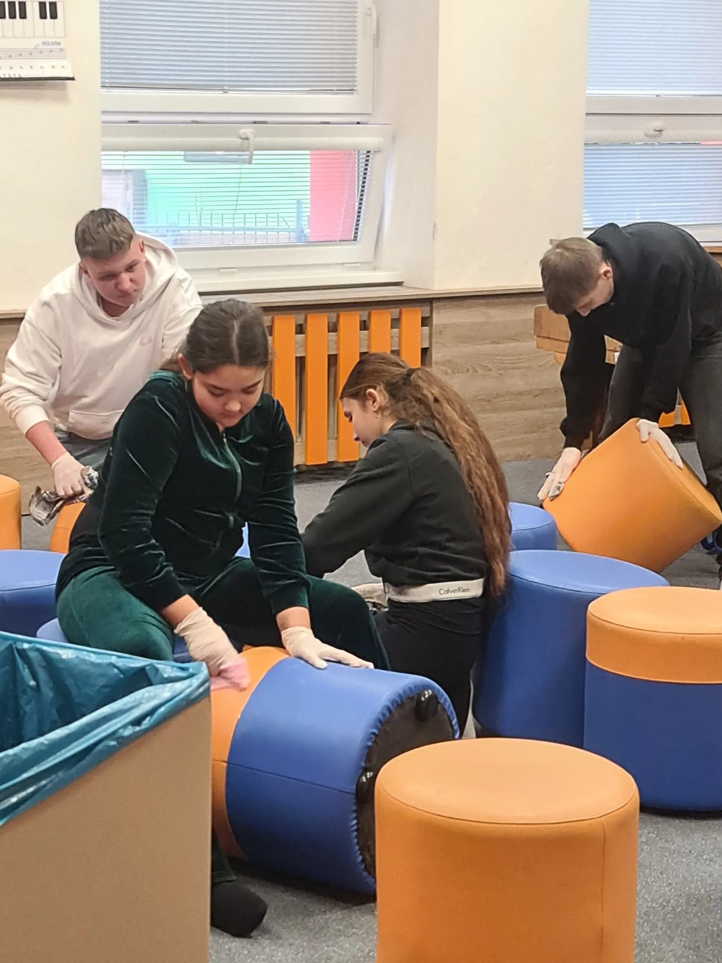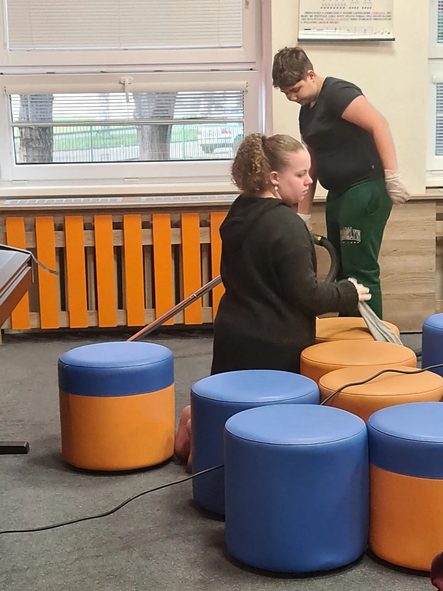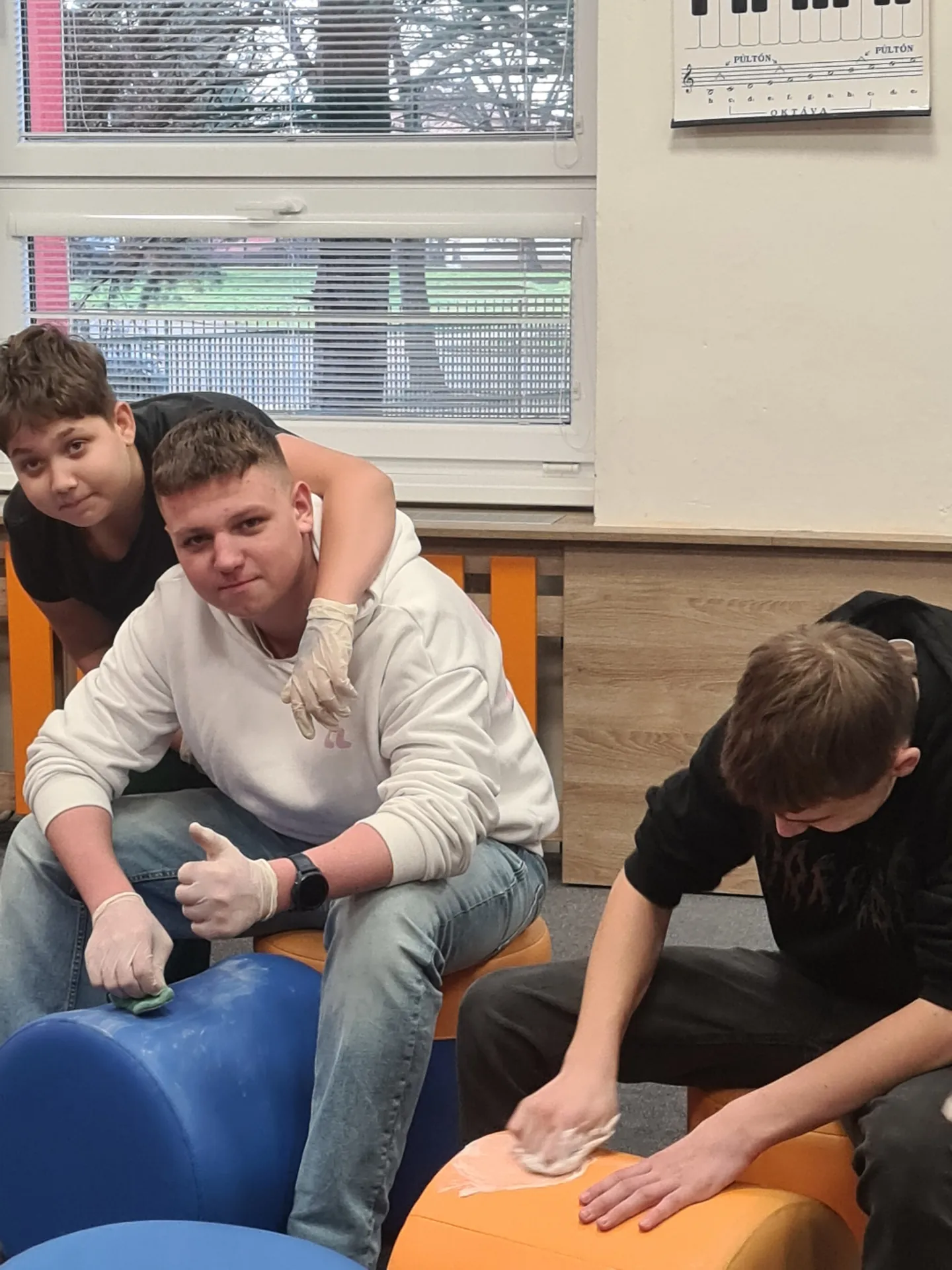 Deset členů ŠP dodrželo slovo a brigáda změřená na čištění taburetů v čítárně a hudebně se opravdu uskutečnila! V úterý 16.12. od 14 hodin do čtvrt na pět se pilně pracovalo, probíhaly intenzivní čisticí práce. Hodně čmáranic, kterými se "někdo" baví v hodinách, se povedlo odstranit, něco bohužel nepustilo, budeme muset příležitostně použít účinnější prostředky. Po ukončení práce přišel vhod nápoj “horké jablko ze zahrádky paní učitelky”, který většině brigádníků chutnal, někdo si osladil “medem od paní učitelky”, někdo dal přednost přírodní formě, ale zasloužili si ho všichni.