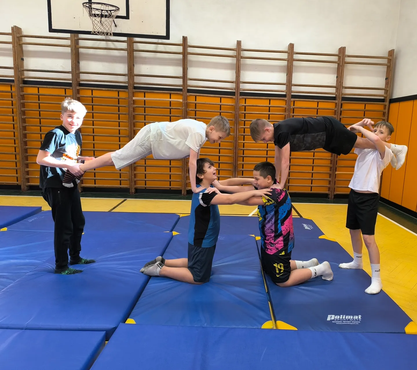Sportovní třída 6.A měla v jedné z hodin tělesné výchovy možnost vyzkoušet si netradiční pohybové aktivity zaměřené na spolupráci a práci s vlastním tělem. Po úvodním zahřátí a krátkých úpolových aktivitách, které prověřily sílu i obratnost, se žáci pustili do stavby tělocvičných pyramid a dalších akrobatických prvků ve dvojicích a menších skupinách.