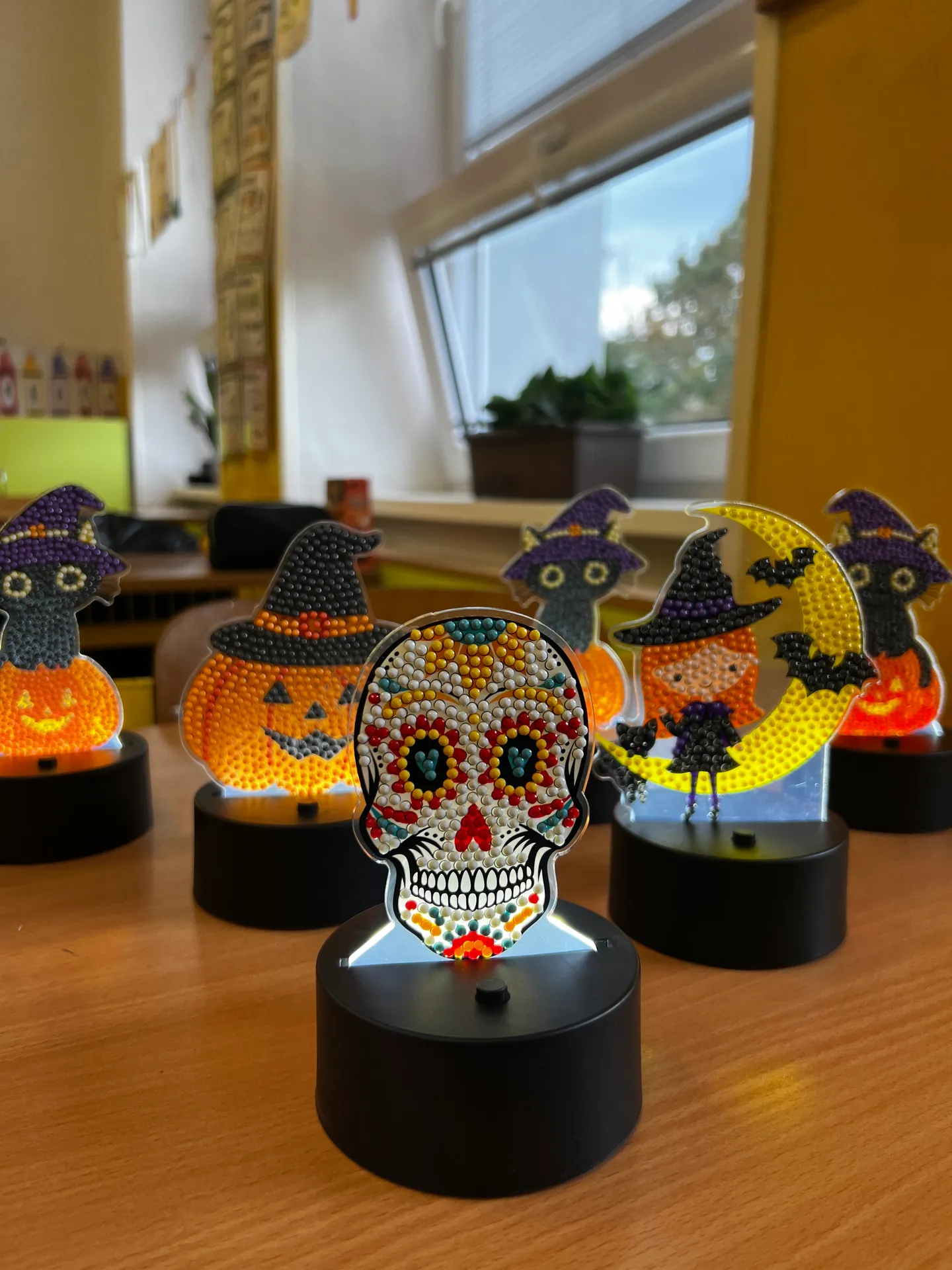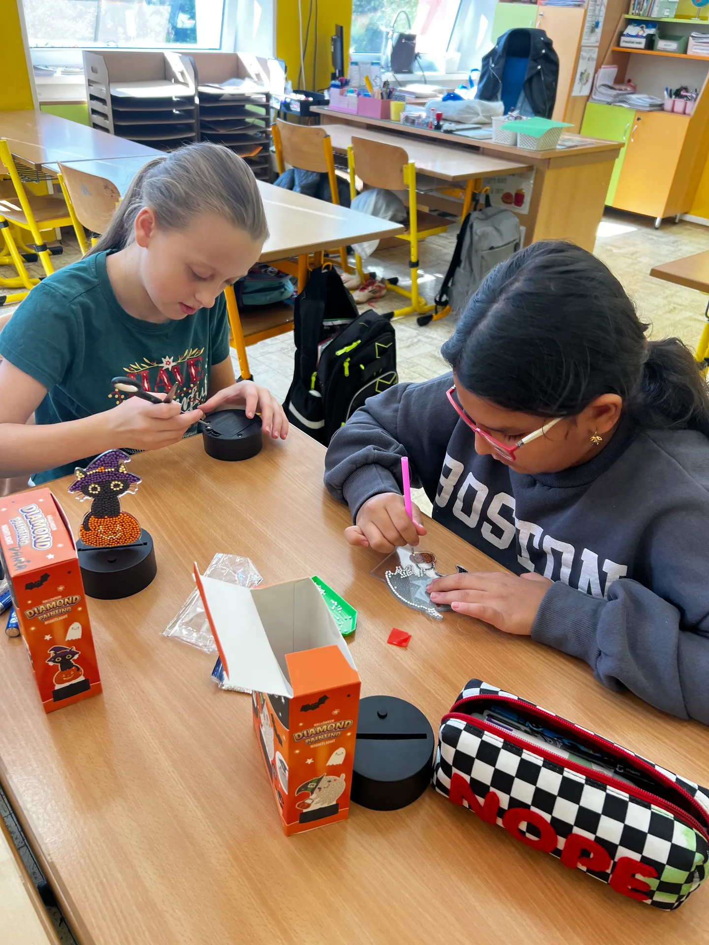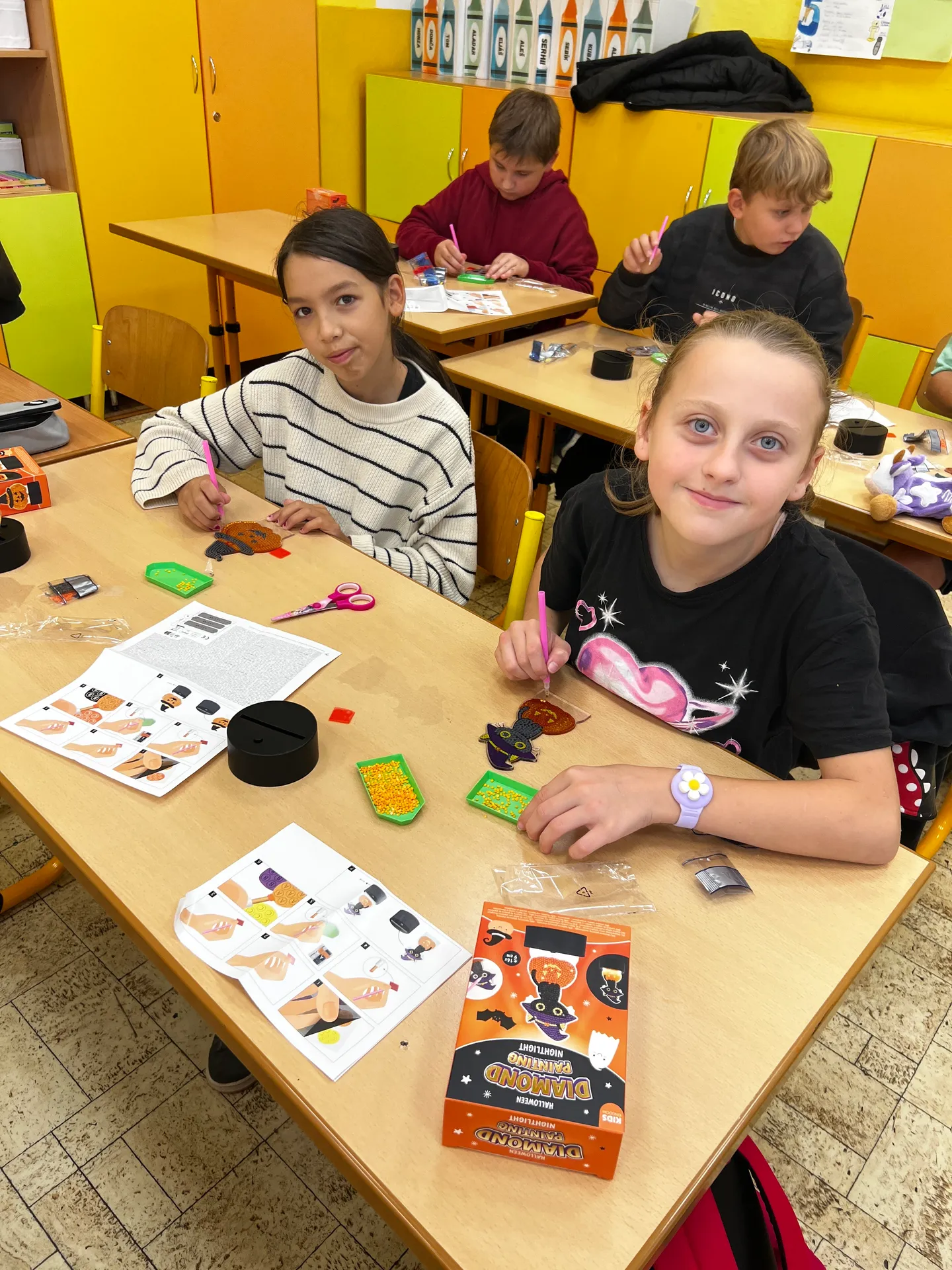Vyzkoušeli si diamantové malování a touto technikou si ozdobili své halloweenské lampičky, které si hrdě odnesli domů Tak už mají první krásnou dekoraci, která jim rozzáří podzimní večery!