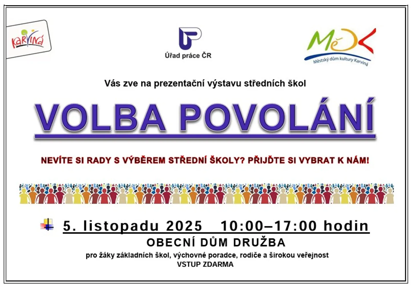 Výstava Volba povolání - bude probíhat v listopadu 2025. Jedná se o aktuální nabídku středních škol všech typů pro školní rok 2026/27. Akce je určena nejen pro žáky základních škol, ale také pro výchovné poradce, rodiče a širokou veřejnost.